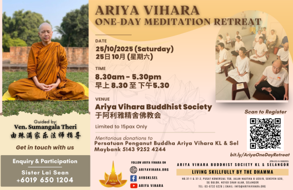 Ariya One-Day Meditation Retreat on 25 Oct 2025 (Sat) from 8.30AM to 5.30PM