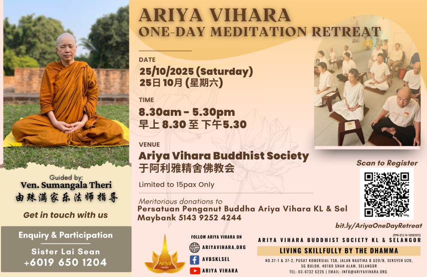 - Ariya One-Day Meditation Retreat on 25 Oct 2025 (Sat) from 8.30AM to 5.30PM